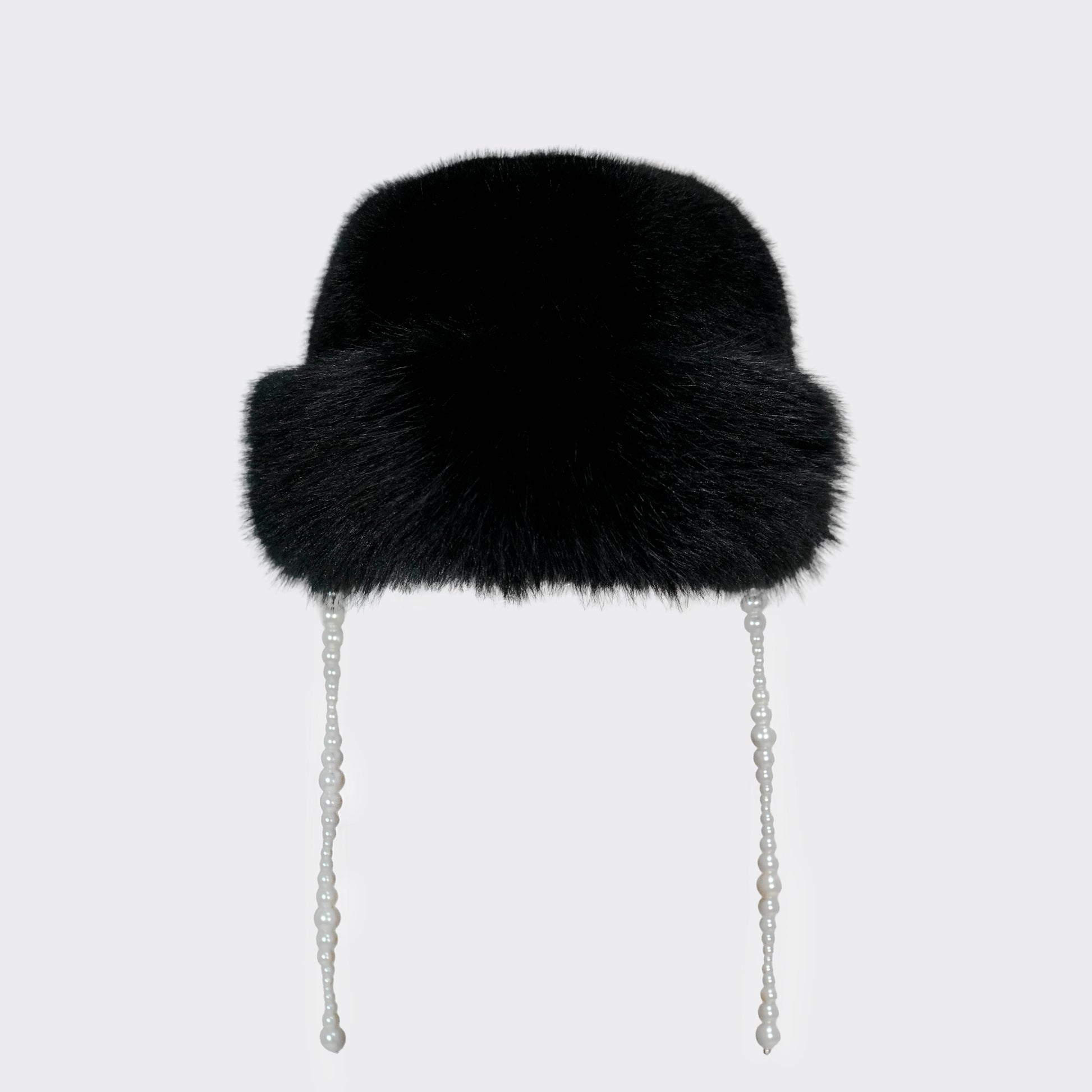 Luxury faux fur hat with pearl string details on the sides and satin lining inside. Soft, warm and lightweight with a sculpted silhouette. A statement winter accessory with a feminine and edgy touch.